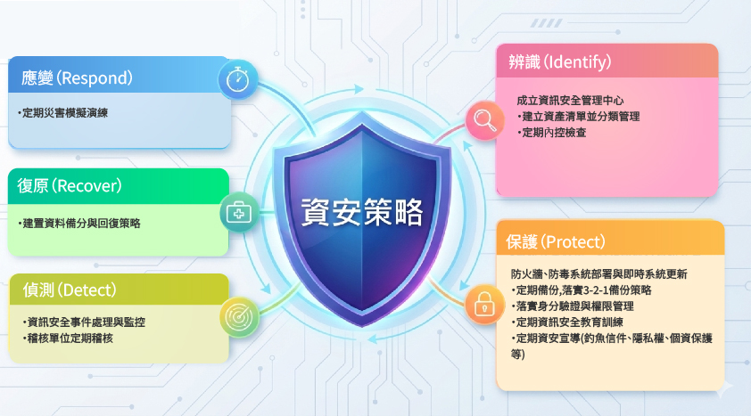 資訊安全管理中心主要負責訂定與執行資訊安全政策、建立資料保護規範以及資訊安全事件處理,預防及降低資訊安全事件發生後之損失。